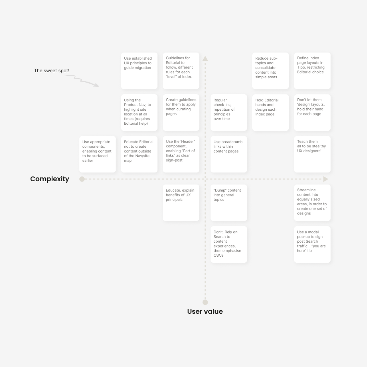 A big part of this process was educating and ensuring we had Editorial buy-in as they would be the team required to curate the index pages. This buy-in started in the discovery phase, by making sure they had a voice and input into problems and solutions.