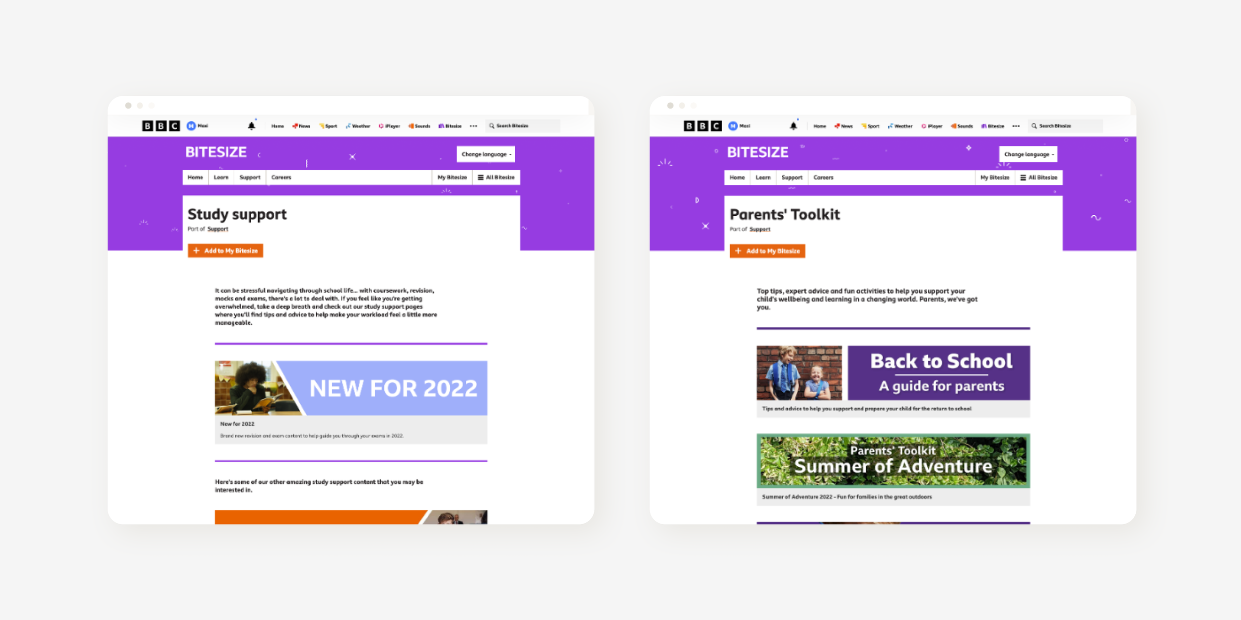 Knowing 50% of user arrived directly to content from search meant it was important we provided users with clear sign posting of where they had arrived. This was important to avoid bounce rates and enable users to continue onward journeys within the Bitesize product.