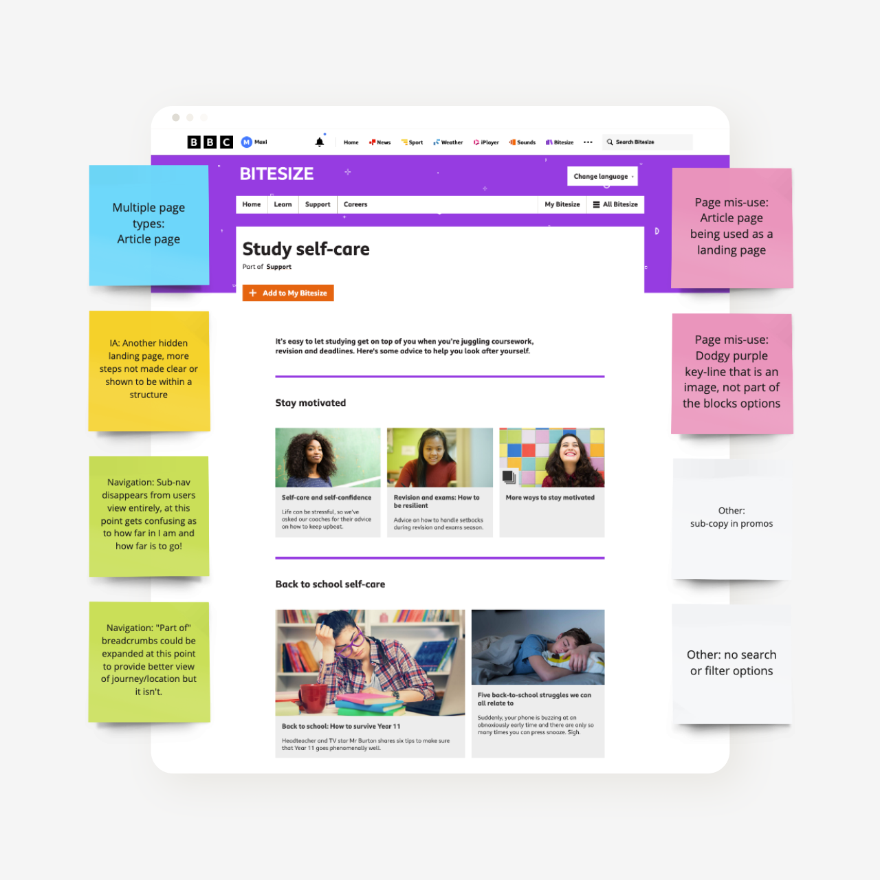 The problem was Bitesize’s site architecture. Over time, it had out grown the product’s navigation, creating multiple routes to content, duplication and poor sign posting. All of these issue contributed to a poor user experience.